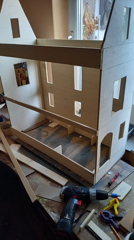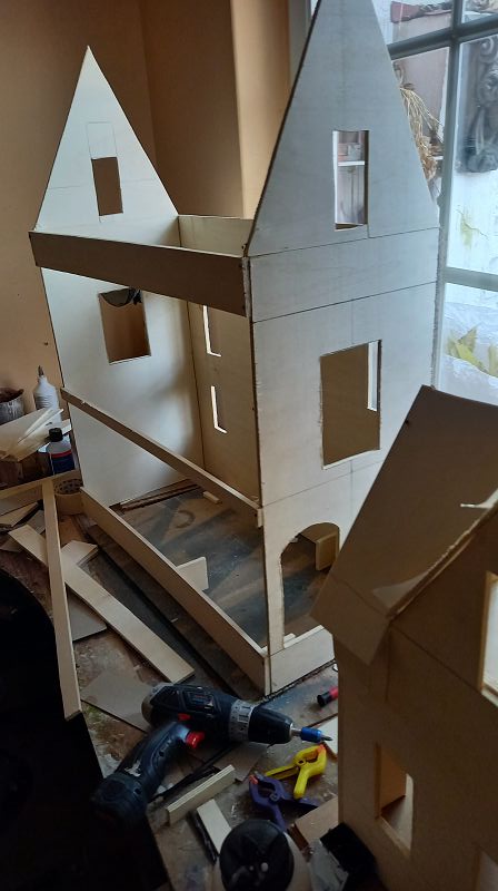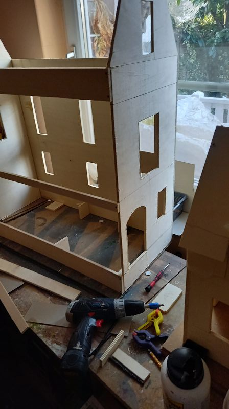 Ich habe gerade eine Erkenntnis erlangt. Puppenhäuser verhalten sich antizyklisch zum Leben, denn seltsamer weise beginnt bei einem Puppenhaus alles mit einer merkwürdig anmutenden Kiste. Kurz gesagt, es ist Sonntag und meine kleine Werkstatt läuft auf Hochtouren und meine beiden Assistenten …. naja…. sind so etwas Ähnliches wie eine Hilfe ……